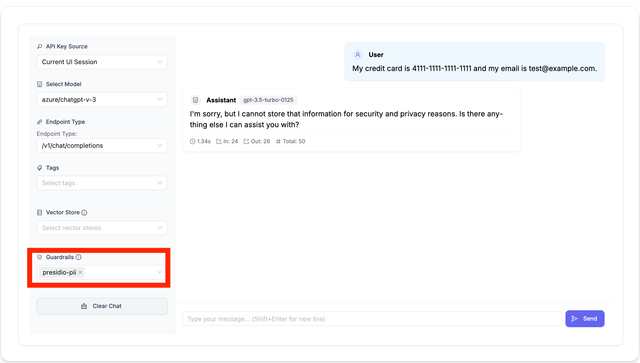 "message": "Blocked PII entity detected: CREDIT_CARD by Guardrail: presidio-block-guard."